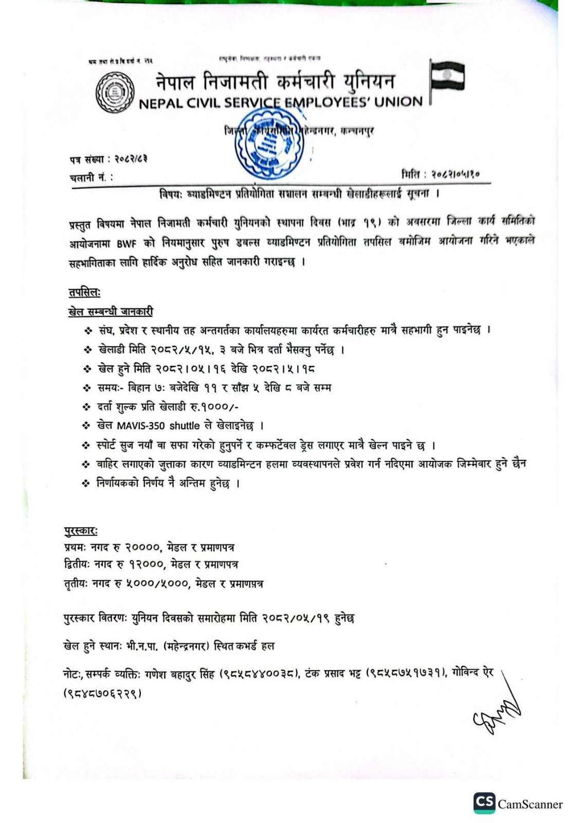 १२ भाद्र २०८२ कंचनपुर : नेपाल निजामती कर्मचारी युनियनको स्थापना दिवसका अवसरमा सप्ताहव्यापी रचनात्मक कार्यक्रम कंचनपुरमा पनि मनाइने भएका छन । कंचनपुर जिल्लाका स्थानिय ,थप जान्नुहोस्