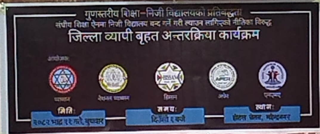 कंचनपुर , ११ भदौ आज महेन्द्रनगरमा अन्तरक्रिया कार्यक्रमको आयोजना गर्दै निजी तथा आवासीय विद्यालय सञ्चालक संघहरूले शिक्षा, स्वास्थ्य तथा प्रविधि समितिबाट पारित भएको विद्यालय शिक्षा विधेयककाथप जान्नुहोस्