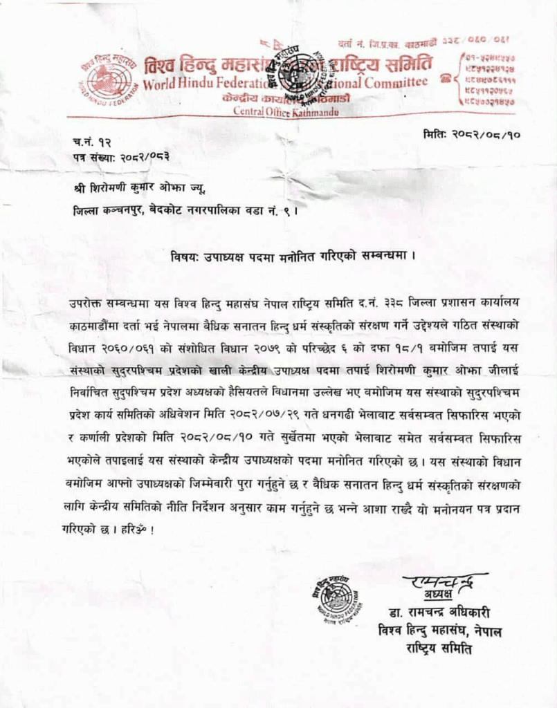 हिन्दु महासंघका नेपालका अध्यक्ष तथा पुर्वमन्त्री डा रामचन्द्र अधिकारी अध्यक्षको हस्ताक्षरित मनोनय पत्रमा सुदुरपश्चिम प्रदेशका अध्यक्ष शिरोमणी ओझालाई संगठन प्रतिको लगनशिलतालाई मध्येनजर राख्दै यहाँलाई विश्व हिन्दुमहासंघको केन्द्रिय उपाध्यक्षको जिम्मेवारी सुम्पेको उल्लेख गरिएको छ ।