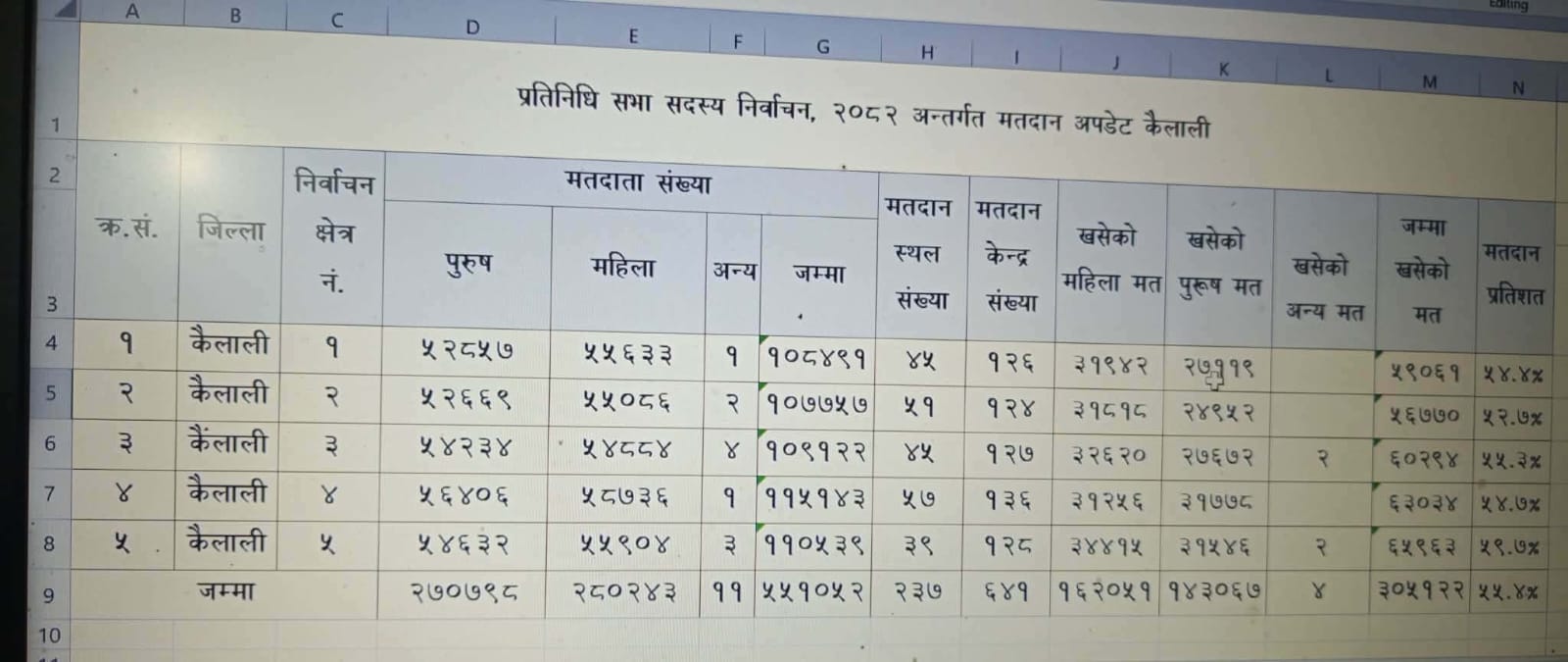 समयः-१३:५०, जिल्लाः-डडेल्धुरानिर्वाचन क्षेत्रः-१जम्मा मतदाता संख्याः-९३४०३खसेको मतमहिलाः-१७२२३पुरुषः-१५८९२जम्माः-३३११५प्रतिशत :- ३५.४०
